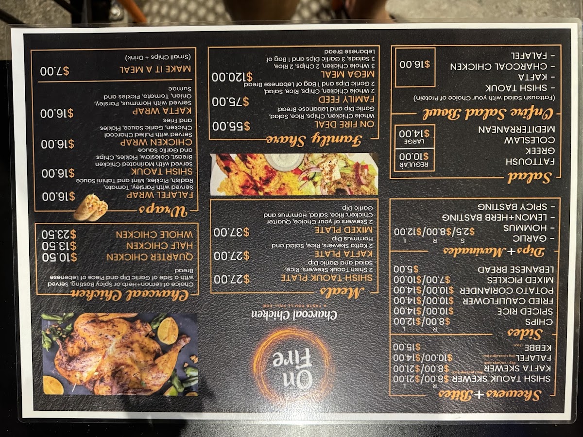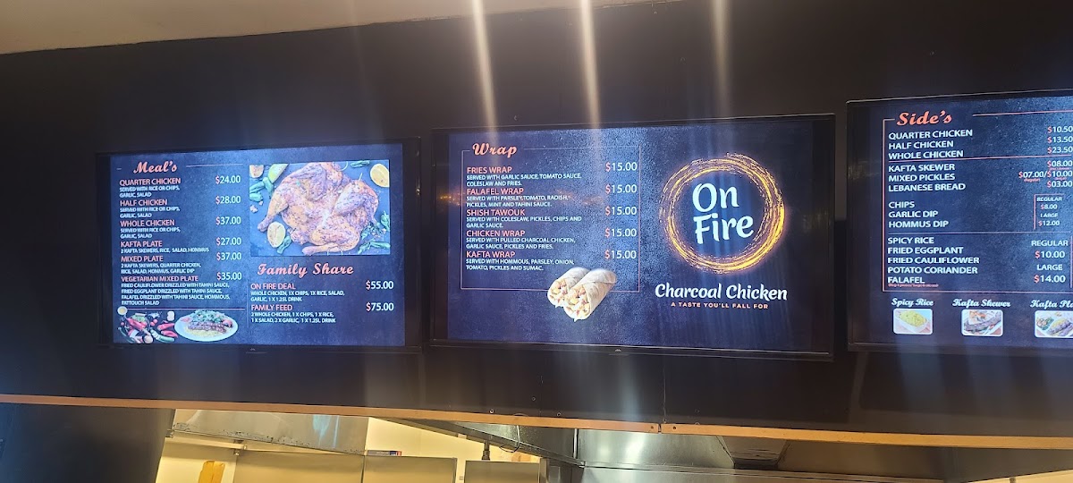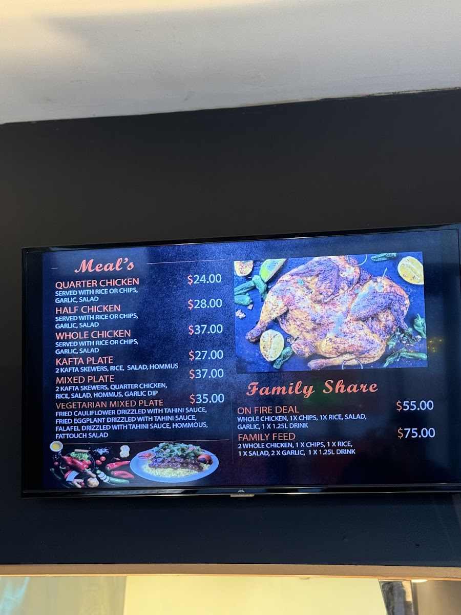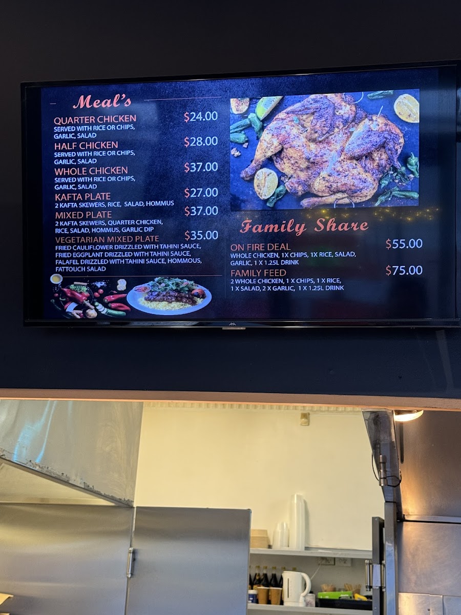 The menu at On Fire Charcoal Chicken in Como offers a delightful range of dishes to suit various tastes. For salads, diners can choose from a Caesar Salad, Mediterranean Salad, Fattoush Coleslaw Salad, and a Chicken Pesto Salad. If you're in the mood for sides, options like Garlic Dip, Spicy Rice, Hummus Dip, and crispy Chips are available. For a family gathering, the On Fire Deal for 4 is a great choice. The restaurant also offers extras such as Mixed Pickles, a 3 Kafta Skewer Pack, and Extra Garlic Dipping Sauce or a Lebanese Bread Pack. Drinks include familiar choices like Coca Cola No Sugar in 600ml and 375ml sizes, as well as Sprite in both 1.25L and 375ml bottles. If you're craving something quick and handheld, the Kafta Wrap, Falafel Wrap, and Chicken Wrap provide a satisfying meal. For heartier options, the Kafta Plate Meal (available with 2 or 4 skewers) and the Mixed Plate are excellent choices. For those seeking a classic poultry dish, the Whole Chicken, Quarter Chicken, and Half Chicken options are grilled to perfection. The diverse menu promises something for everyone, from light salads to hearty meals and tasty sides, making On Fire Charcoal Chicken a perfect spot for any occasion.