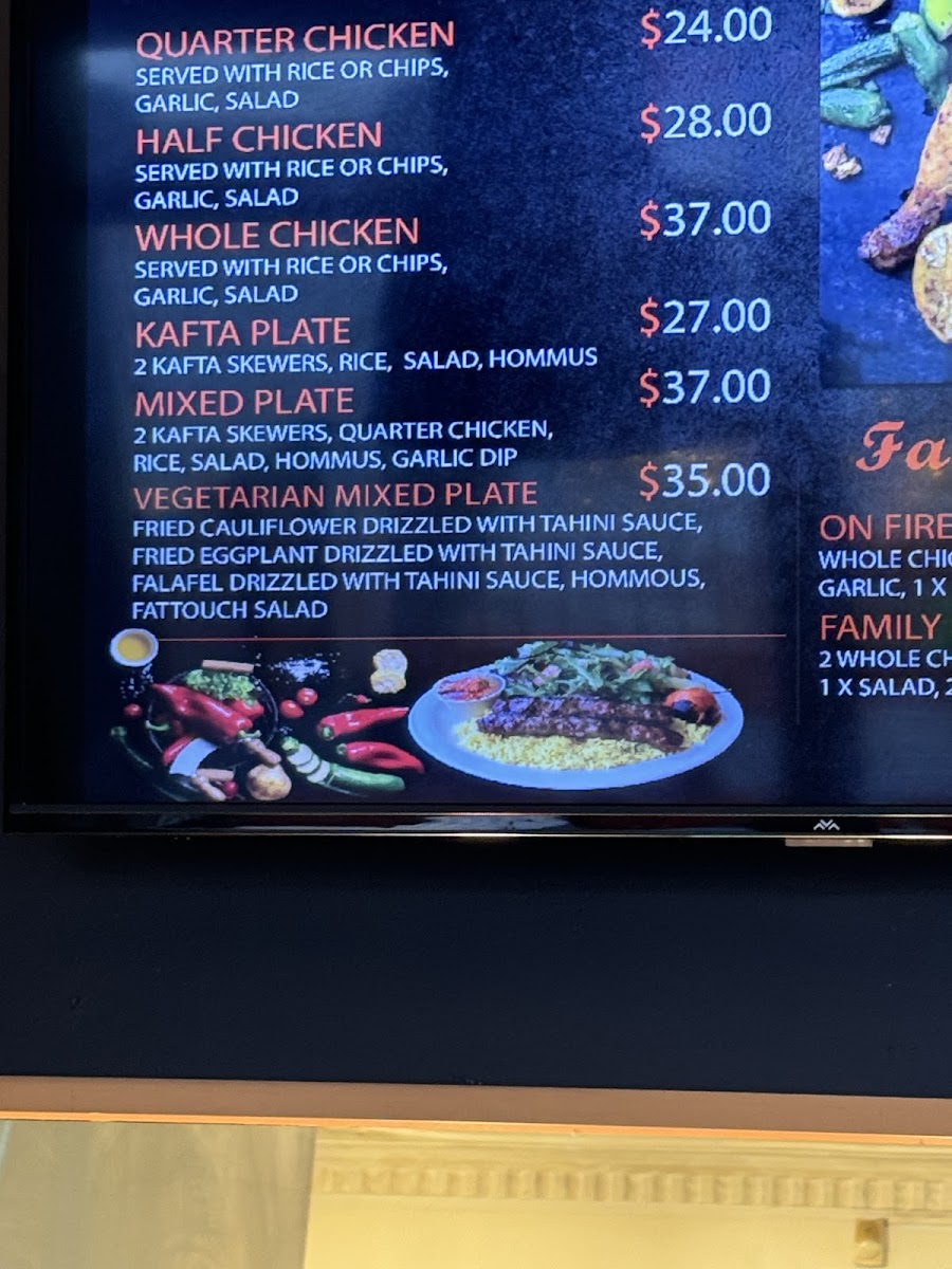 Get ready to enjoy seriously good meal with two kafta skewers (minced meat mixed with chopped parsley and chef special spices) cooked over charcoal grill and served with Juicy quarter charcoal chicken, spicy rice,salad,hummus dip and garlic dip.